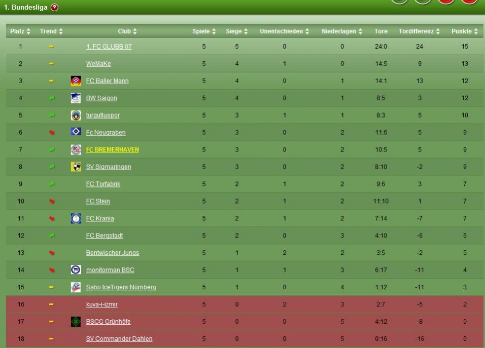 Besonders freue ich mich über FC Torfabrik, der sich nach einer längeren Zeit wieder mit mir in der Liga messen darf. Aber vorne wird wohl wieder Glubb den Ton angeben. Sabo hat anscheinend an Stärke verloren und bei den neuen (Neugraben, Bremerhaven) muss ich mir erstmal ein paar Spiele ansehen. Es sollte auf jeden Fall wieder spannend werden...