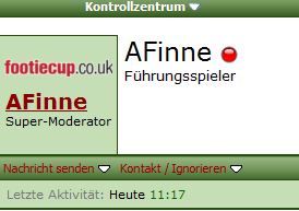 Super. Ich bin nur am Wochenende online. Deswegen habe ich versucht A.Finne Feuer unter dem Gesäß zu machen, dass wir die Spiele austragen können. Er war ja heute gleichzeitig online, aber er musste dann unbedingt frühstücken. Ich habe alles getan, um irgendwie Kontakt mit ihm herzustellen (Mail im Forum, 2 Mails im InGame, Suche nach ihm in seinem Clan, Suche nach ihm im EuropaLeague-Thread, Kontaktanfrage im InGame geschickt).