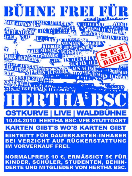Die Ticketpreise liegen bei 10,00 bzw. ermäßigt 5,00 Euro (Dauerkarteninhaber der Ostkurve, Mitglieder von Hertha BSC, Schüler, Studenten, Rentner und Schwerbehinderte) zzgl. 0,50 Euro Systemgebühr. Der Vorverkauf startet am Donnerstag (01.04.10).