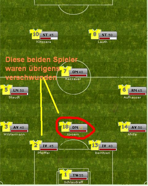 und zwar habe ich heute bei meiner Aufstellung gesehen, dass auf einmal 2 Spieler weniger auf dem Platz waren ohne dass ich sie davor heruntergestellt habe. Deshalb bin ich dann auch gestern mit 2:6 untergegangen...