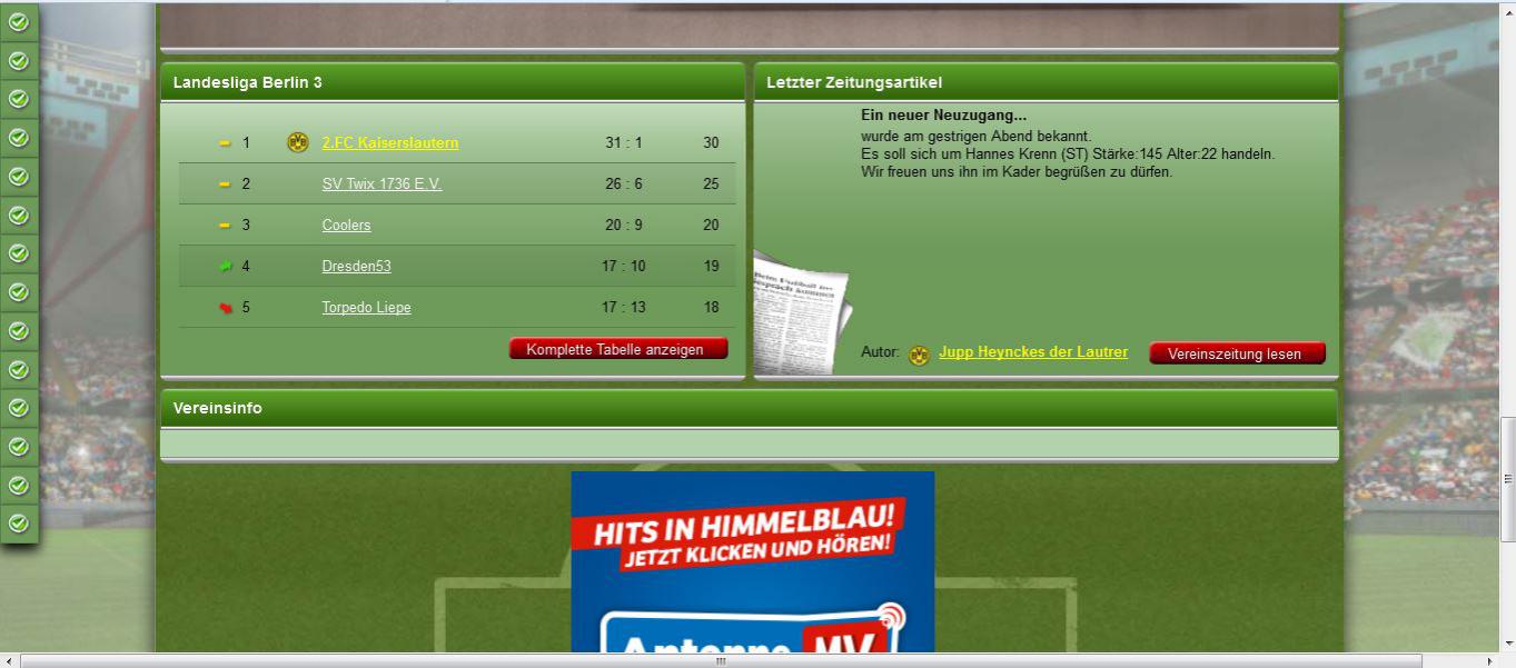 P.S.: Muss noch dazu sagen (falls sich jemand das ganze anschauen möchte): Die rechts angegebenen Daten sind noch von meinem inzwischen gelöschten Verein. Die aktuellen lauten: Manager: Jupp Heynckes der Lautrer ; Team: 2.FC Kaiserslautern ; Liga: Landesliga ; Stadiongröße: 20.800