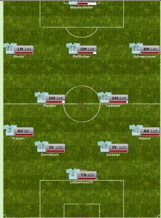In der Aufstellungsansicht kann ich unter anderem nicht mehr mein Torwart in untere Bild (Ins Tor) stellen. Immer wenn ich ihn nach unten ziehe und loslasse springt er wieder nach oben (wie im Bild). Das gleich passiert mit den IV's auch die kann ich nicht mehr ein Feld nach unten ziehen.