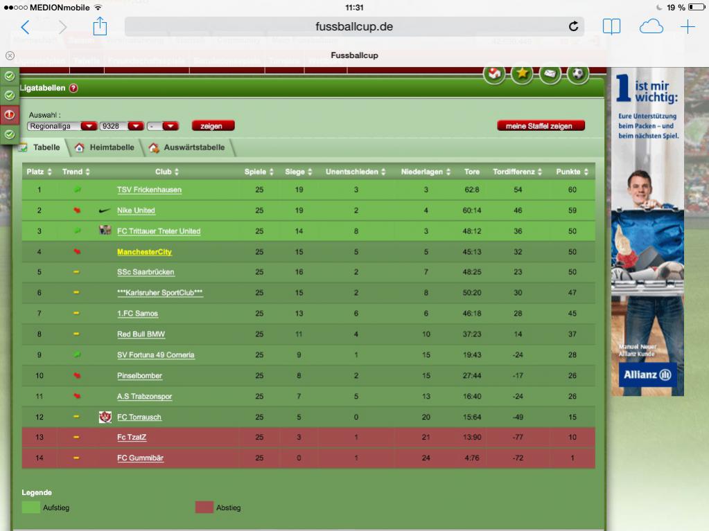 Heute trete ich gegen den 11 Platz an,gegen den ich heute ein 3:0 Sieg erreichen müsste da seit mehreren Spielen dieser Manager unter 8 o. 7 Spieler auf dem Feld hat.