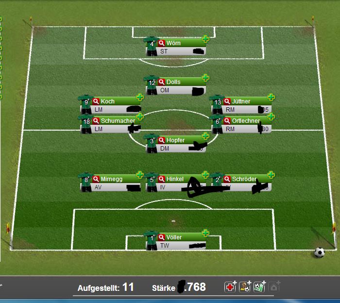 PS. An diejenigen, die ohne TW spielen wollen: Man kann zwar vor Spielbeginn mit 3 LM/RM und ohne TW mit Aufstellungsbonus auflaufen, jedoch wird automatisch zu Spielbeginn ein Spieler ins Tor gestellt, der dann natürlich prompt an seiner Stärke verliert. Damit geht dann auch der Aufstellungsbonus flöten.