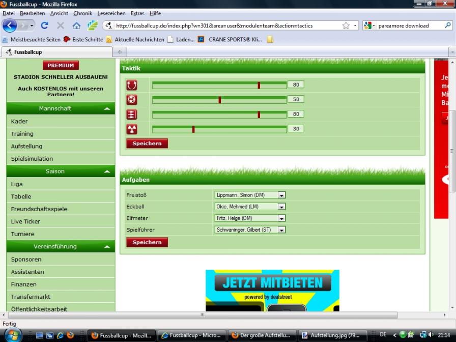 Spiele in Ermangelung eines vernünftigen 2. Stürmers jetzt schon ne Weile in der Aufstellung - habe aber in letzter Zeit zu wenig Tore erzielt - Taktik ist atm 40-30-50-40