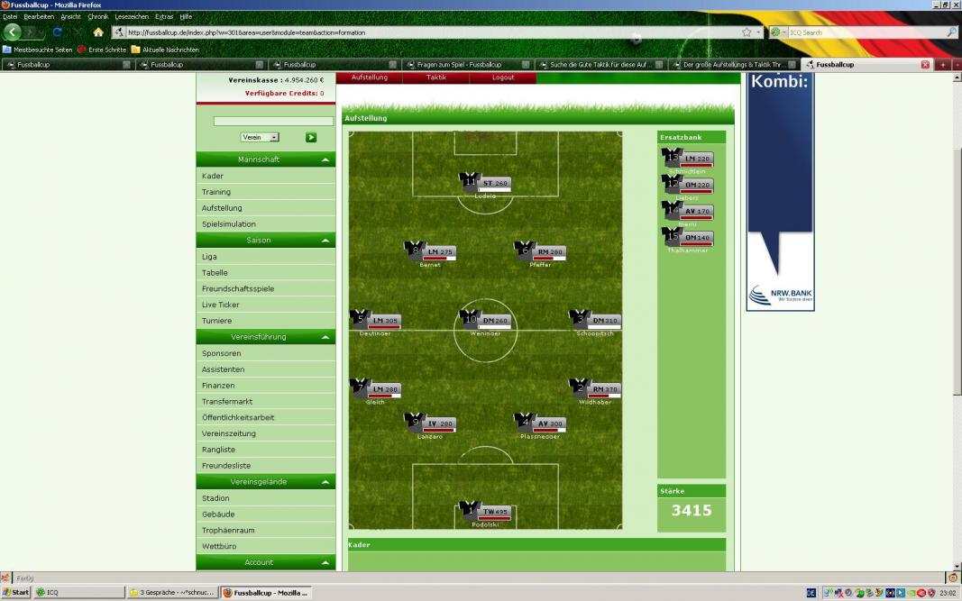 aber meine neuzugänge sind schon länger als 2-3 tagen da^^ bestimmt ne woche jetzt.... heute bin ich 1:0 hinten gelegen gegen einen Kumpel mit einer as von 590...hab in der letzten minute den ausgleich gemacht. gestern hab ich 1 : 0 verlorn :eek: hab zwar auch nur 865 aber das dürfte doch normalerweise reichen oder ist meine aufstellung und taktik wirklich so schlecht ?