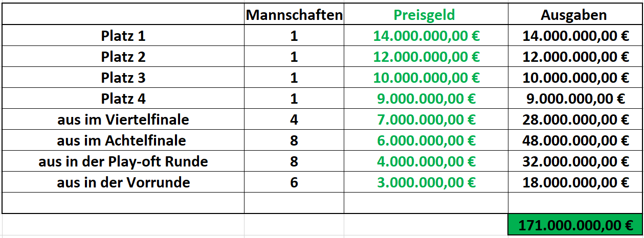 Sollte ein Team ein oder mehrere (ohne Begründung) Spiele nicht absolvieren, so wird pro Spiel 500.000,00 vom Preisgeld abgezogen.