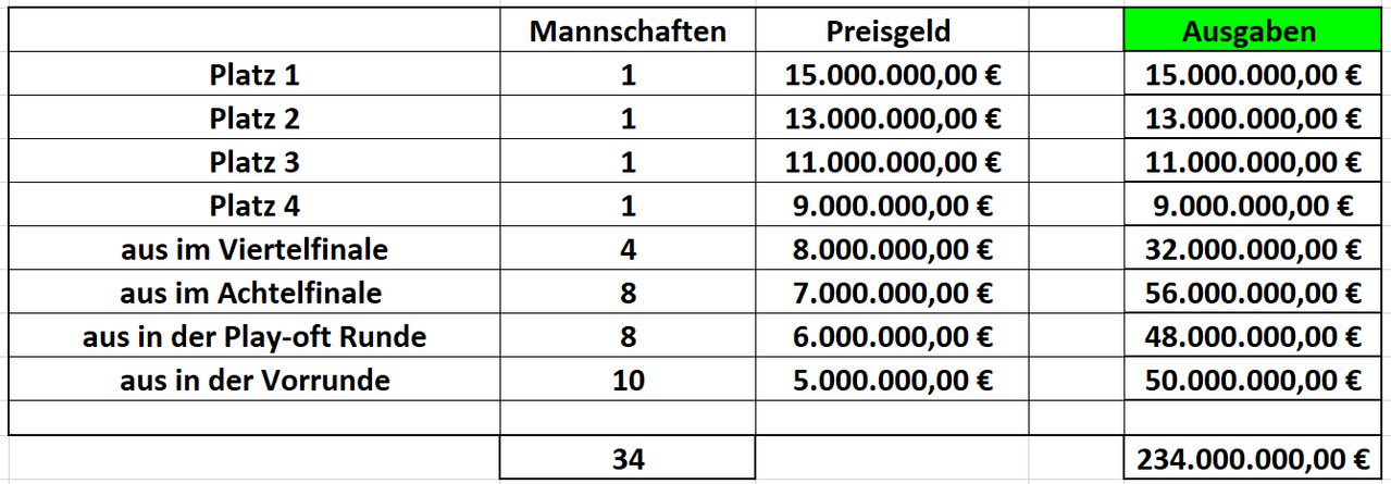 Sollte ein Team ein oder mehrere (ohne Begründung) Spiele nicht absolvieren, so wird pro Spiel 500.000,00 vom Preisgeld abgezogen.