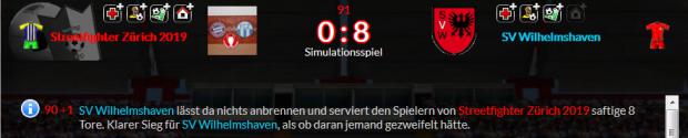 90 +1 SV Wilhelmshaven lässt da nichts anbrennen und serviert den Spielern von Streetfighter Zürich 2019 saftige 8 Tore. Klarer Sieg für SV Wilhelmshaven, als ob daran jemand gezweifelt hätte.